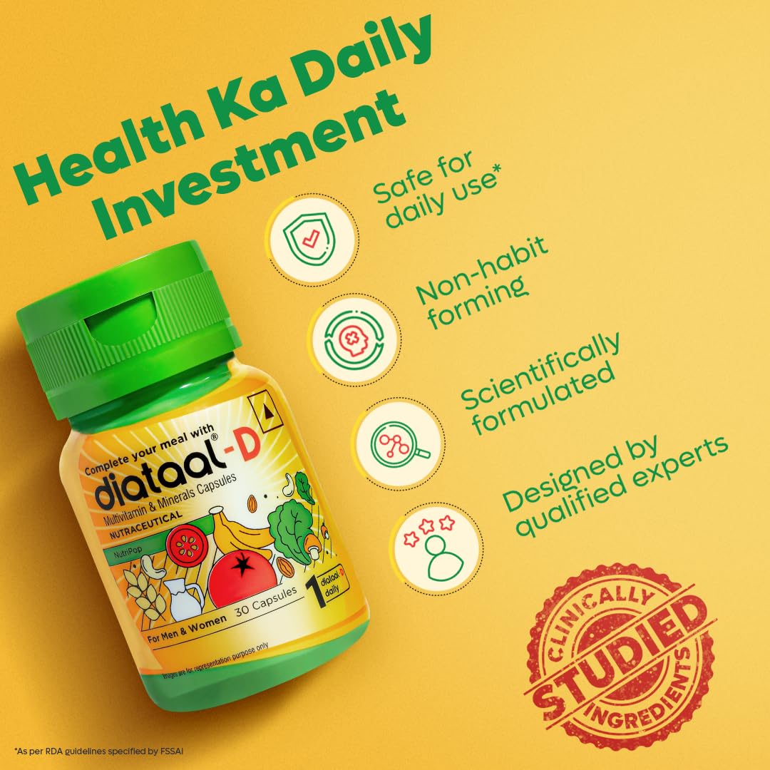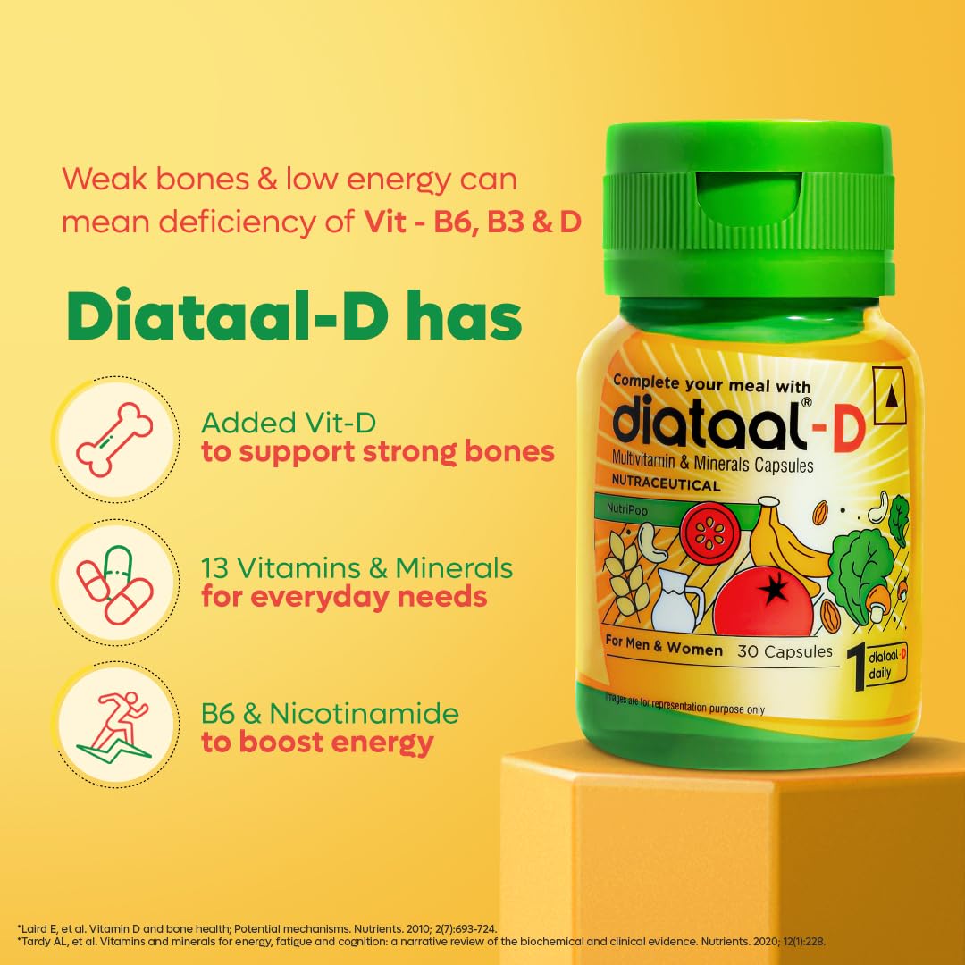 Diataal-D: Multivitamin for Men & Women from the house of USV - with 62 years of trust in the pharmaceutical industry & India's #1 in Oral Anti-Diabetic & Cardiovascular Market (by prescription). Boost your energy effortlessly with Diataal-D! Packed with vitamin D and B complex, it strengthens your bones and fights fatigue, so you can #FeelTrulyFit every single day Powered by 13 vitamins and minerals, and Alpha Lipoic Acid, Diataal-D supports your overall wellbeing